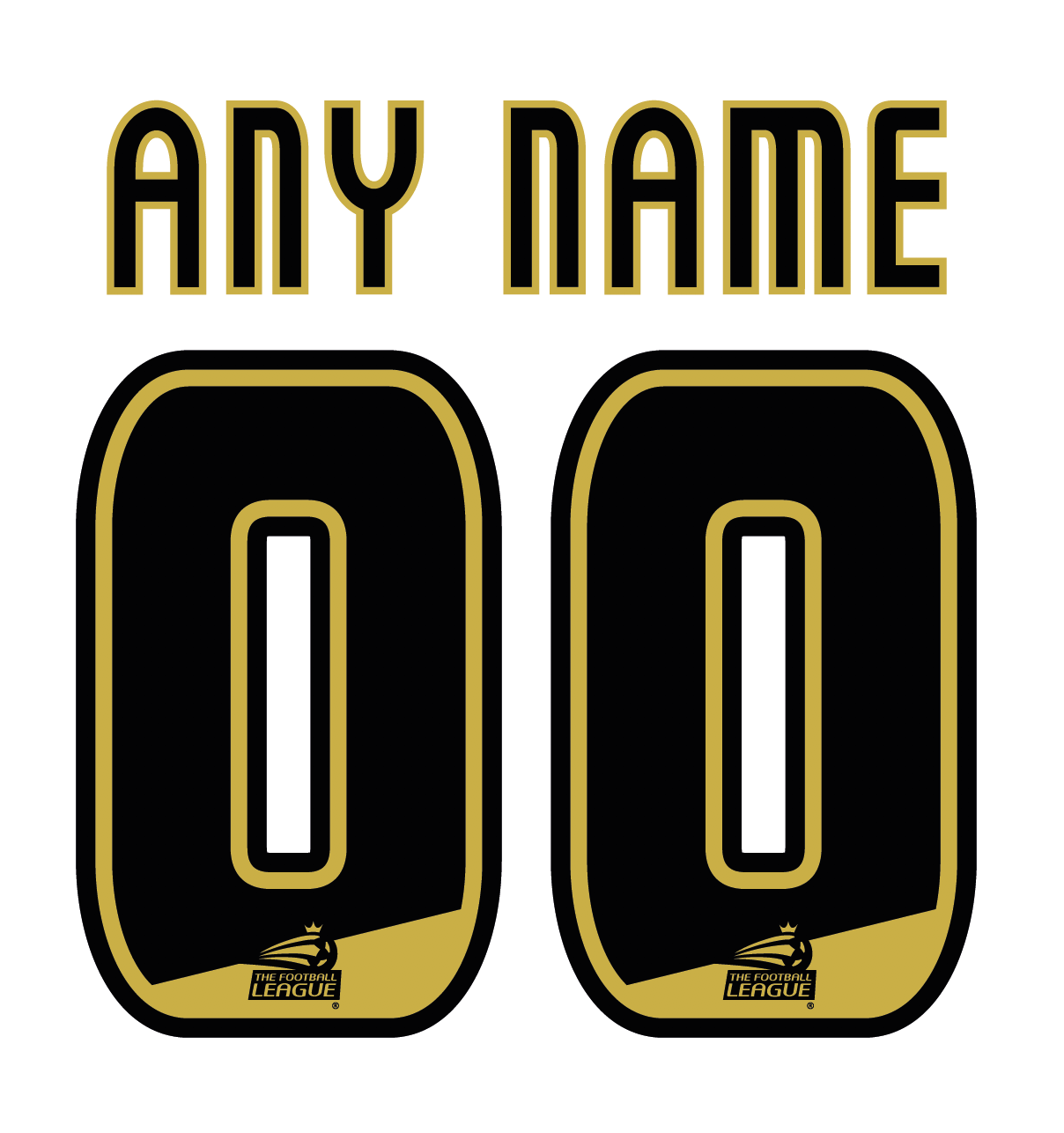 Player size (65mm letters, 230mm numbers) gold and black name and number set, as worn by EFL teams. Any name and number available, please message the name and number required when ordering. Please feel free to message other requests.