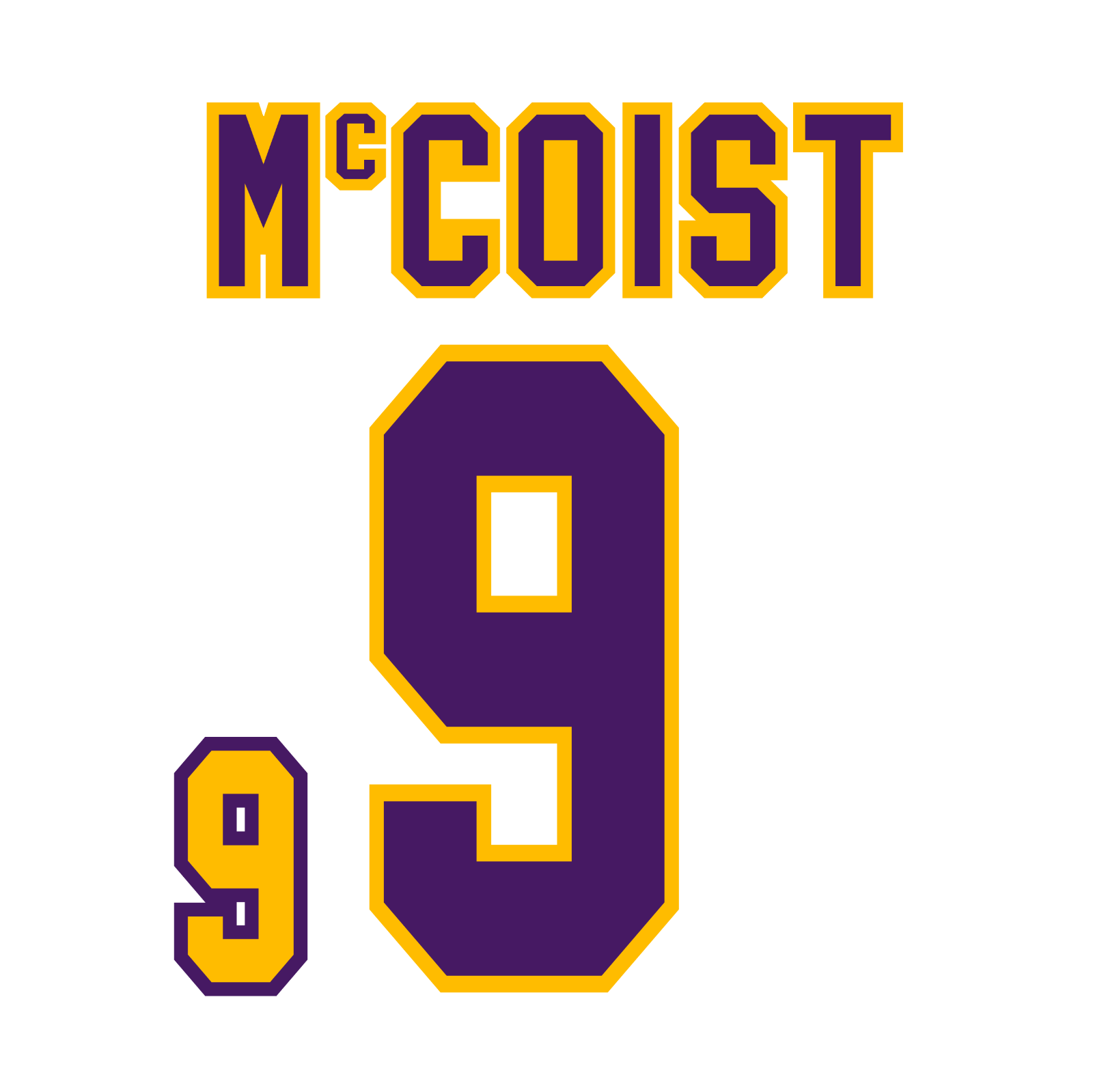 Any name and number available upon request. High quality dual layer flock (velvet feel) print like those worn by players (one purple and one warm yellow layer). Small number for the front of the shirt will also be included (reversed colours, as pictured).